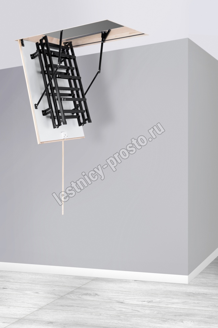 Лестница складная трехсекционная. Рабочая поверхность полностью выполнена из металла и покрашена порошковой краской. Термоизоляционная крышка типа "сэндвич", толщиной 30 мм, утеплена пенопластом, облицована с двух сторон ДCП белого цвета.